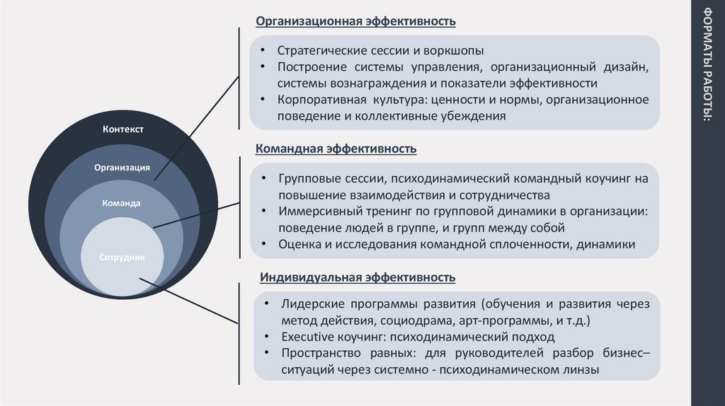 • Стратегические сессии и воркшопы• Построение системы управления, организационный дизайн,