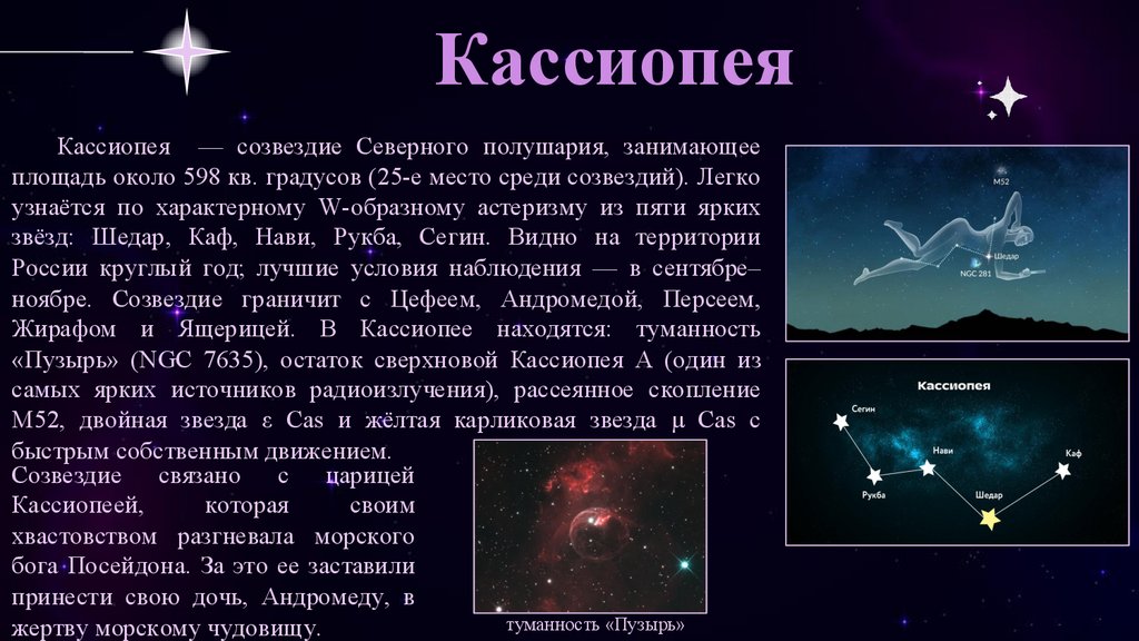 Жирафом и Ящерицей. В Кассиопее находятся: туманность
