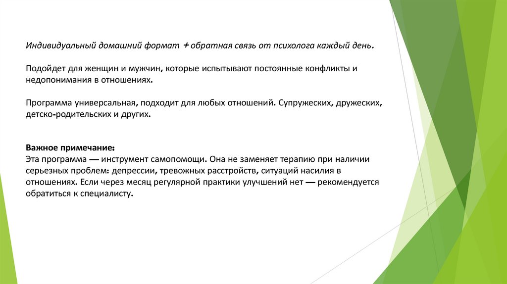Индивидуальный домашний формат + обратная связь от психолога каждый день.Подойдет для женщин и мужчин, которые испытывают постоянные конфликты и