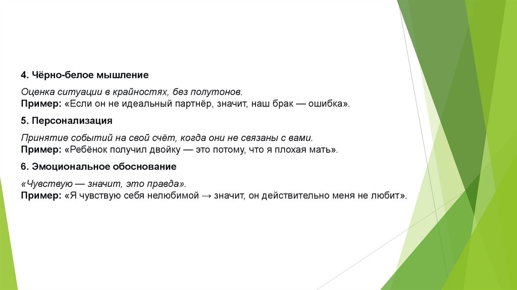 4. Чёрно-белое мышлениеОценка ситуации в крайностях, без полутонов.
