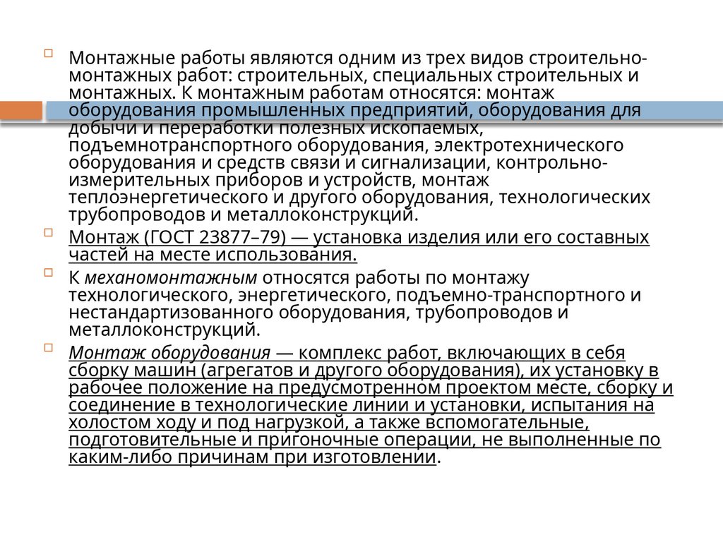 Монтажные работы являются одним из трех видов строительномонтажных работ: строительных, специальных строительных имонтажных. К монтажным работам относятся: монтаж