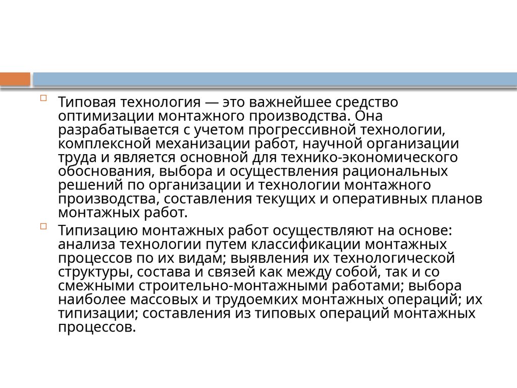 Типовая технология — это важнейшее средствооптимизации монтажного производства. Она