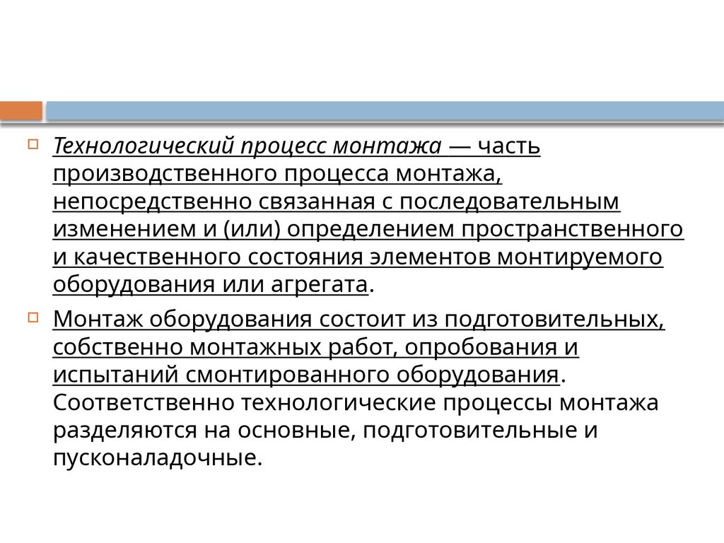 Технологический процесс монтажа — частьпроизводственного процесса монтажа,