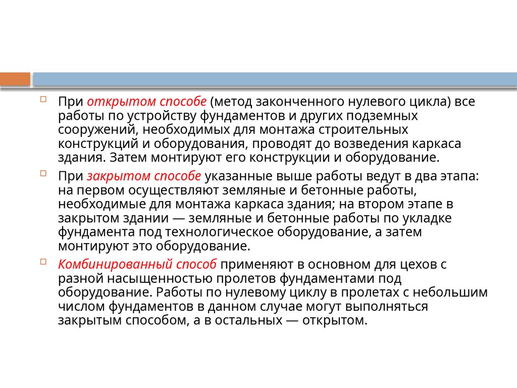 При открытом способе (метод законченного нулевого цикла) всеработы по устройству фундаментов и других подземных