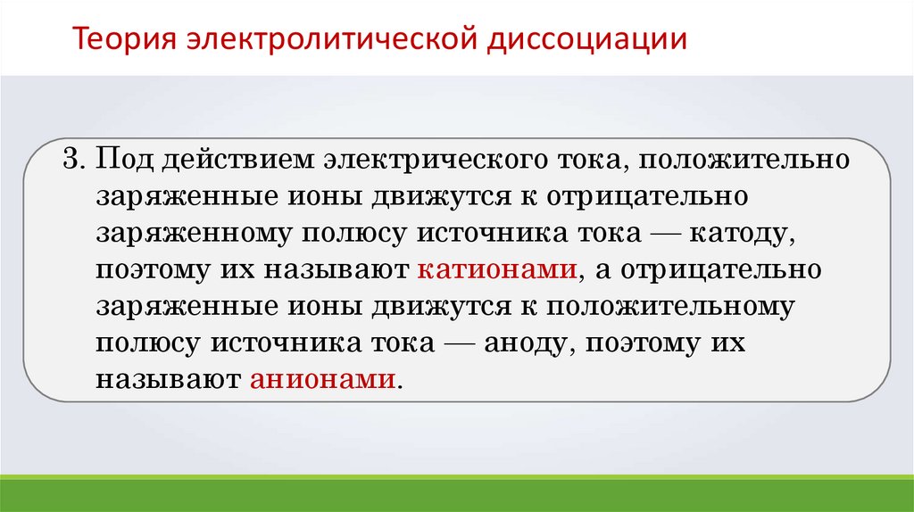 Теория электролитической диссоциации3. Под действием электрического тока, положительно
