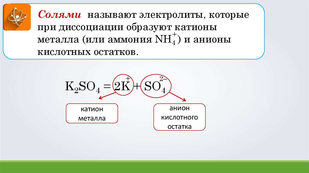 Солями называют электролиты, которыепри диссоциации образуют катионы