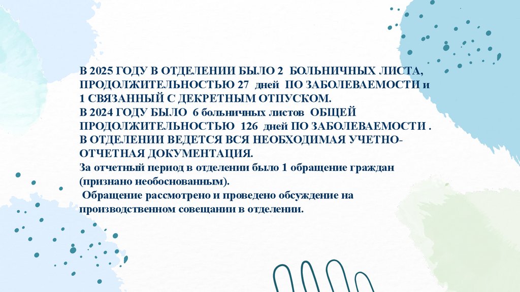 В 2025 ГОДУ В ОТДЕЛЕНИИ БЫЛО 2 БОЛЬНИЧНЫХ ЛИСТА,ПРОДОЛЖИТЕЛЬНОСТЬЮ 27 дней ПО ЗАБОЛЕВАЕМОСТИ и