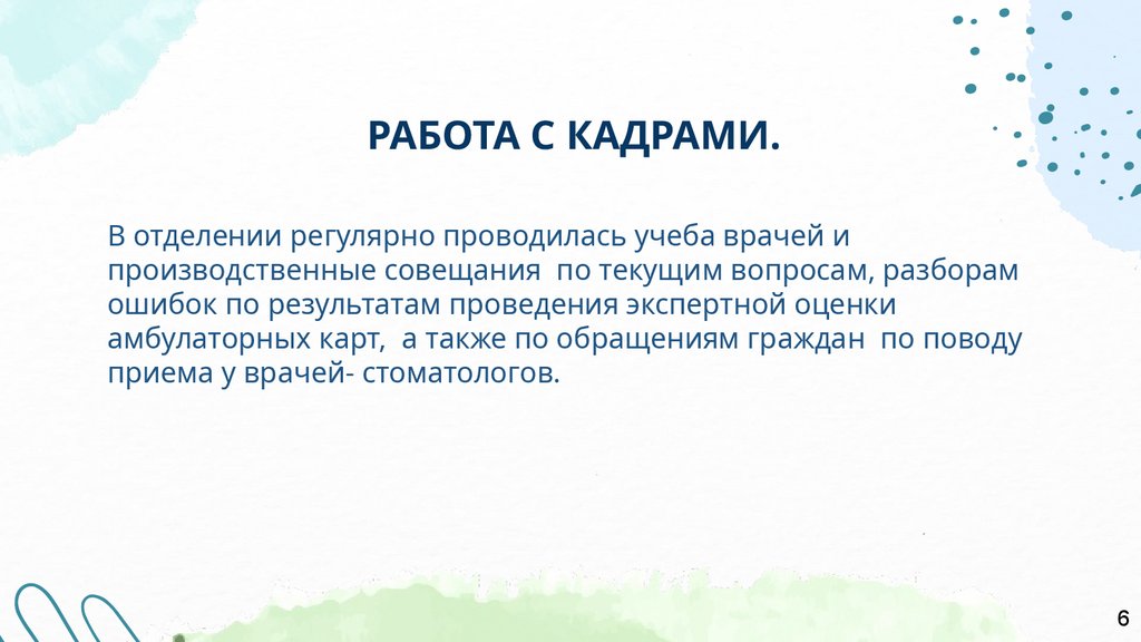 РАБОТА С КАДРАМИ.В отделении регулярно проводилась учеба врачей и