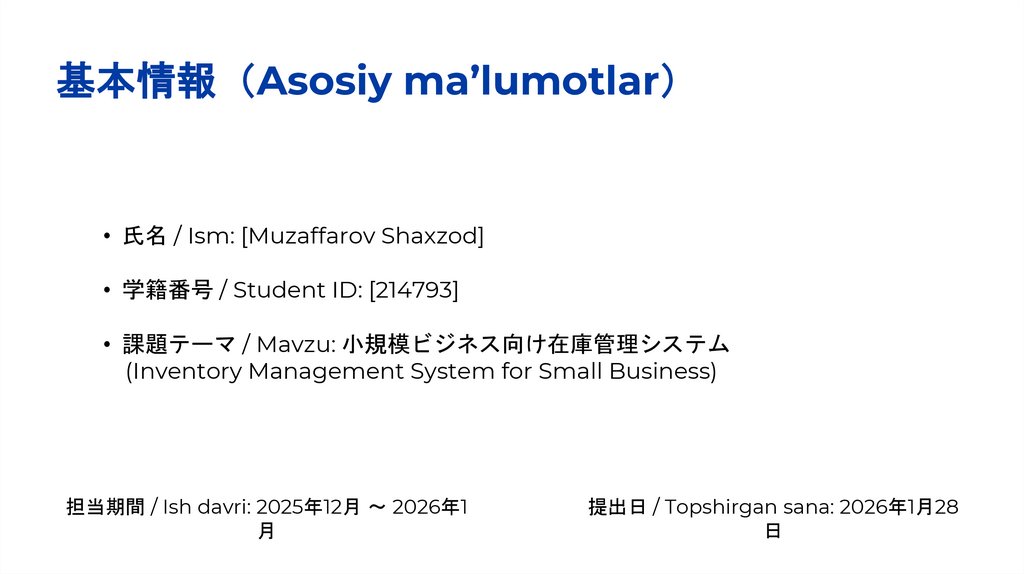 • 課題テーマ / Mavzu: 小規模ビジネス向け在庫管理システム