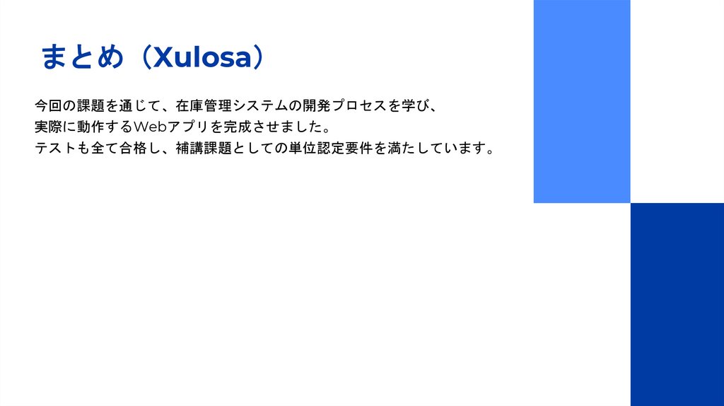 まとめ Xulosa今回の課題を通じて、在庫管理システムの開発プロセスを学び、