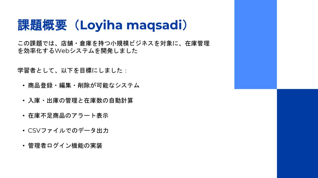 課題概要 Loyiha maqsadiこの課題では、店舗・倉庫を持つ小規模ビジネスを対象に、在庫管理