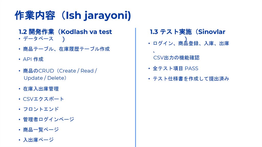 作業内容 Ish jarayoni)1.2 開発作業 Kodlash va test