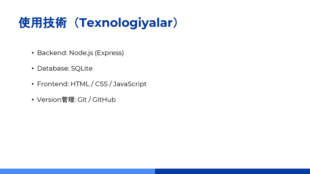 使用技術 Texnologiyalar• Backend: Node.js (Express)
