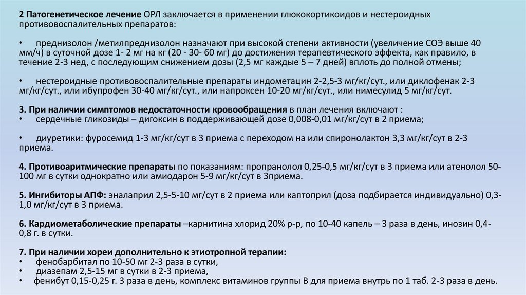2 Патогенетическое лечение ОРЛ заключается в применении глюкокортикоидов и нестероидныхпротивовоспалительных препаратов: