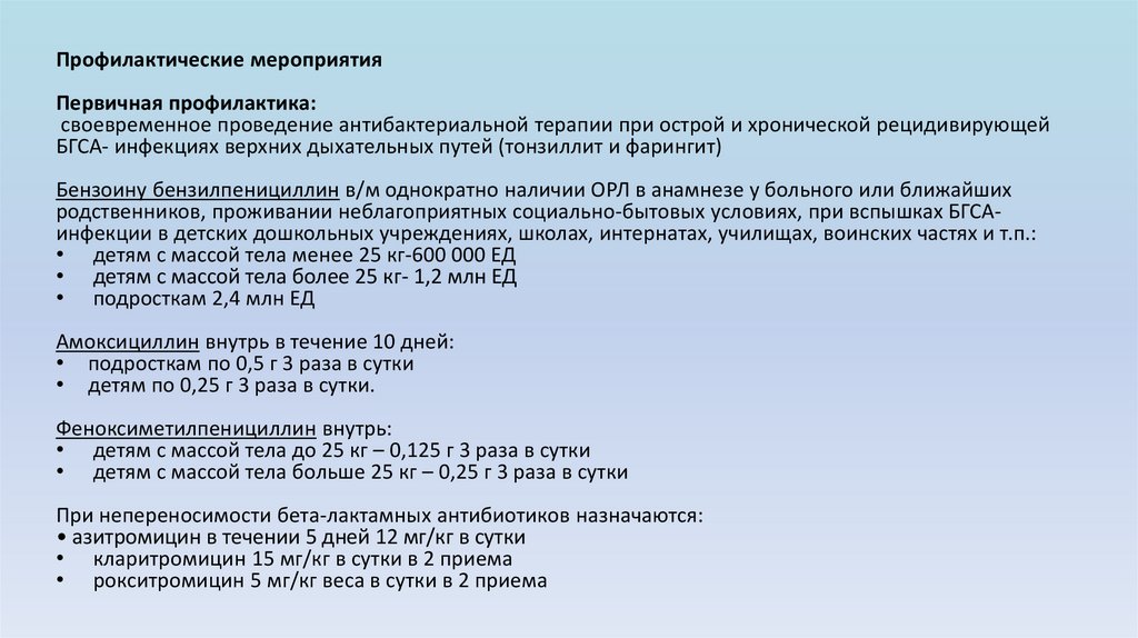 Бензоину бензилпенициллин в/м однократно наличии ОРЛ в анамнезе у больного или ближайших