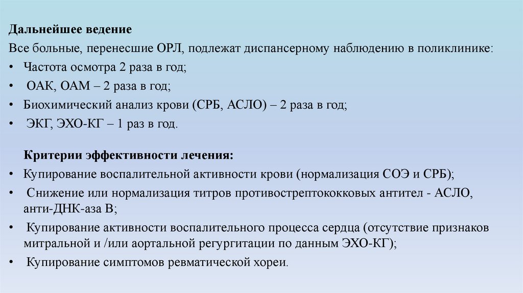 Дальнейшее ведениеВсе больные, перенесшие ОРЛ, подлежат диспансерному наблюдению в поликлинике: