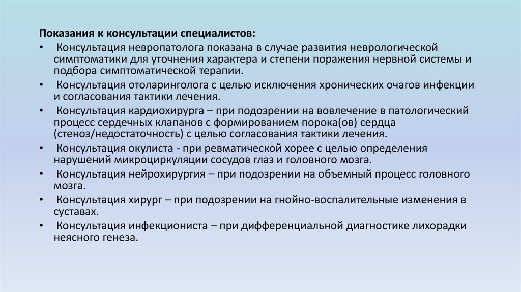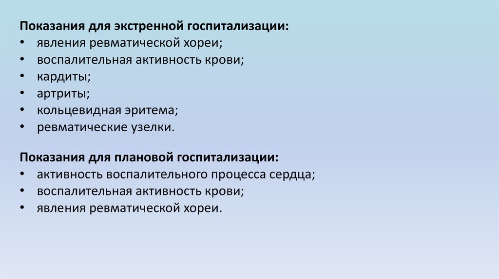 Показания для экстренной госпитализации:• явления ревматической хореи;