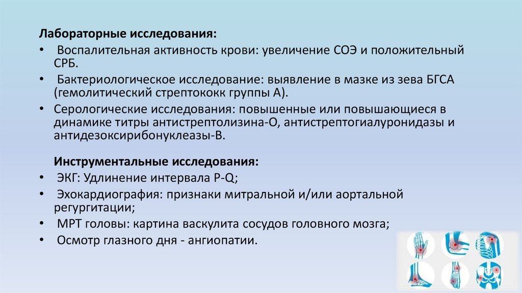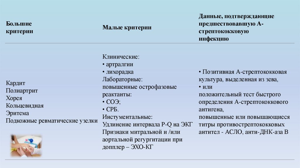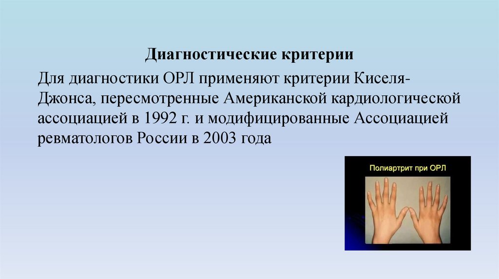 Диагностические критерииДля диагностики ОРЛ применяют критерии КиселяДжонса, пересмотренные Американской кардиологической