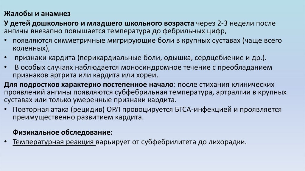 Жалобы и анамнезУ детей дошкольного и младшего школьного возраста через 2-3 недели после