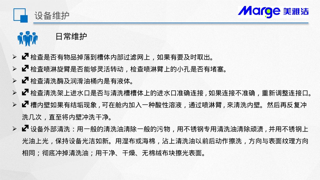 设备外部清洗 用一般的淸洗油淸除一般的污物 用不锈钢专用清洗油淸除顽渍 , 并用不锈钢上