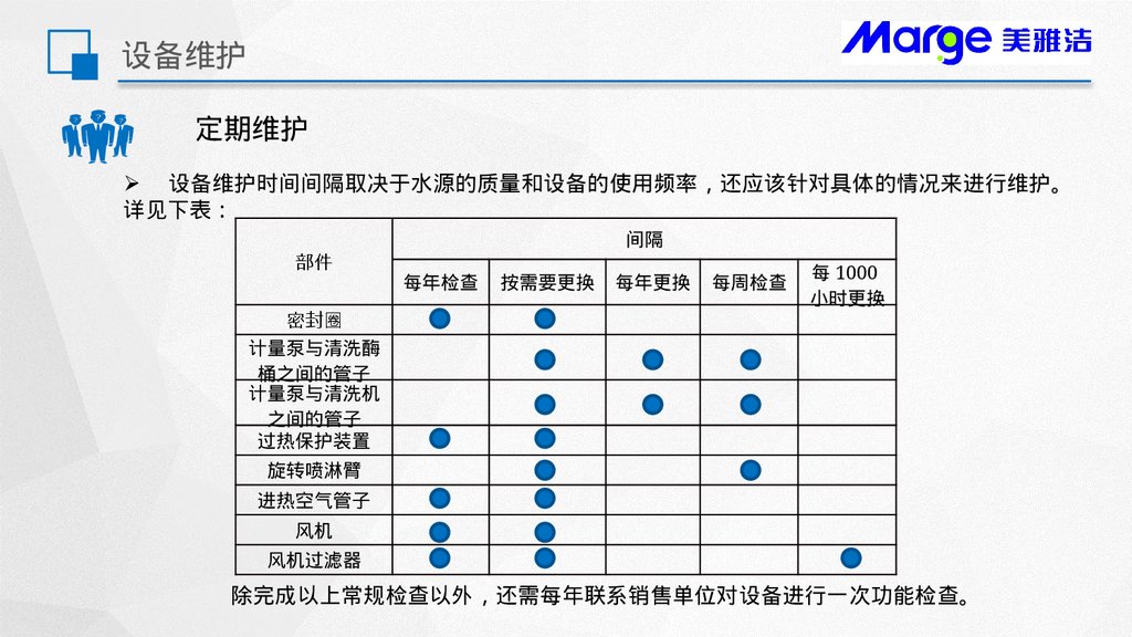 Ø 设备维护时间间隔取决于水源的质量和设备的使用频率 还应该针对具体的情况来进行维护。