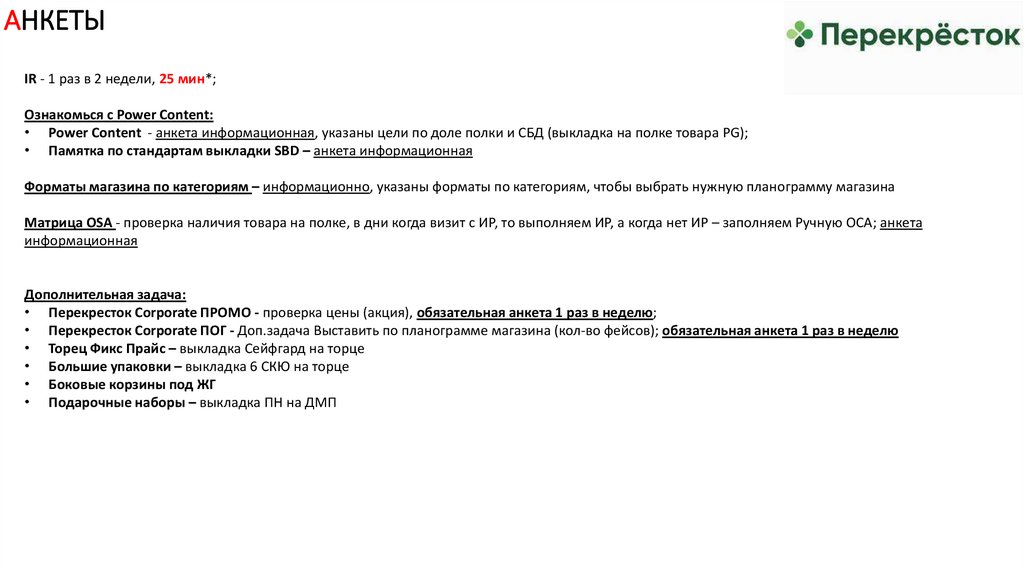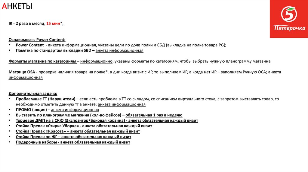 АНКЕТЫ – новые сетиIR матрица (ручная OSA) - проверка наличия товара на полке*, анкета обязательная каждый визит