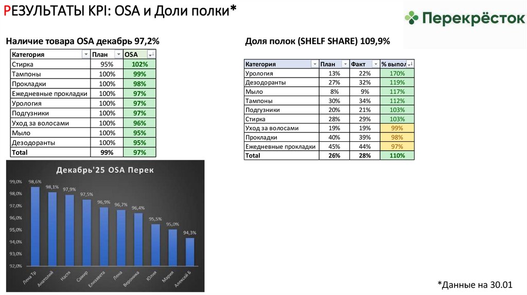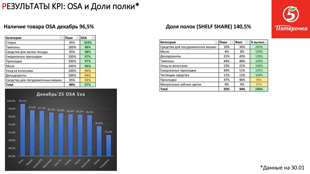 РЕЗУЛЬТАТЫ KPI: OSA и Доли полки*Наличие товара OSA декабрь 96,5%