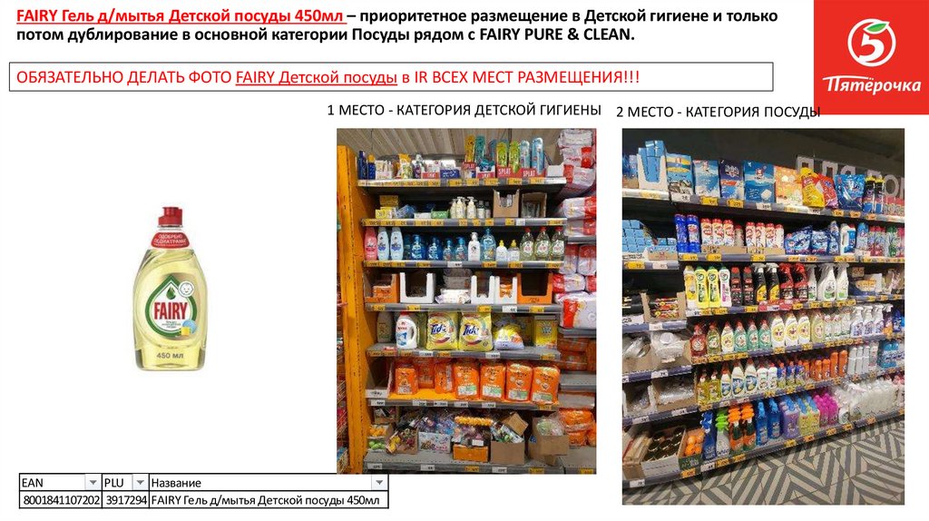 FAIRY Гель д/мытья Детской посуды 450мл – приоритетное размещение в Детской гигиене и толькопотом дублирование в основной категории Посуды рядом с FAIRY PURE & CLEAN.