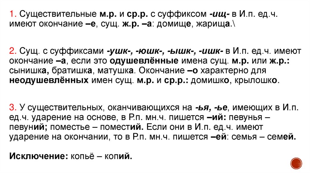 1. Существительные м.р. и ср.р. с суффиксом -ищ- в И.п. ед.ч.имеют окончание –е, сущ. ж.р. –а: домище, жарища.\