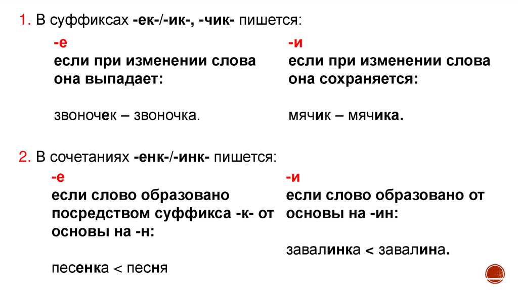 1. В суффиксах -ек-/-ик-, -чик- пишется:-е
