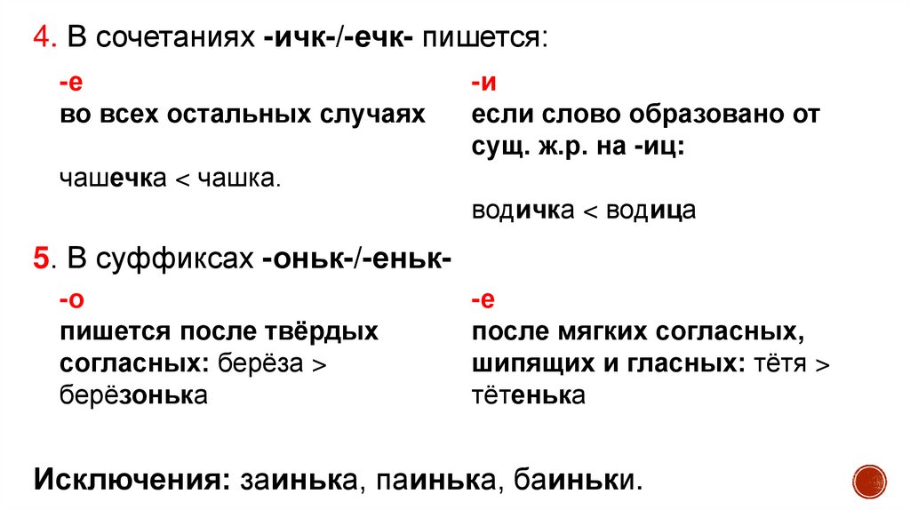 4. В сочетаниях -ичк-/-ечк- пишется:-е