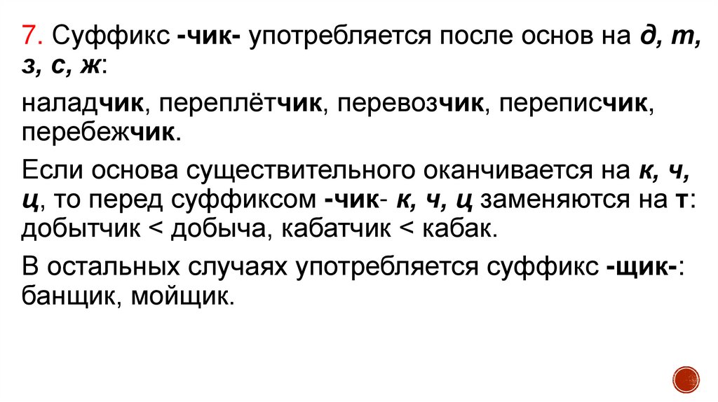 7. Суффикс -чик- употребляется после основ на д, т,з, с, ж: