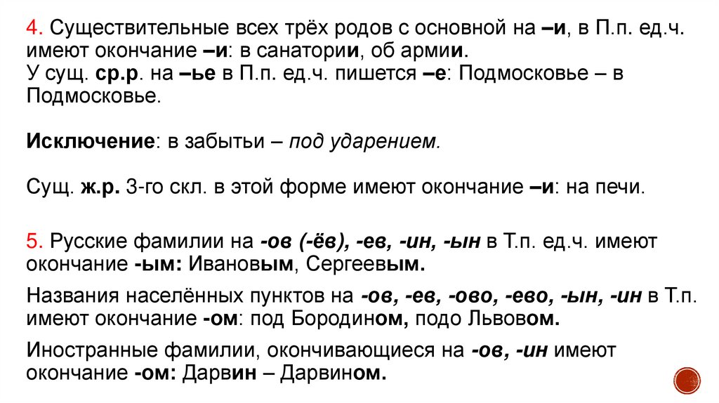 4. Существительные всех трёх родов с основной на –и, в П.п. ед.ч.имеют окончание –и: в санатории, об армии.