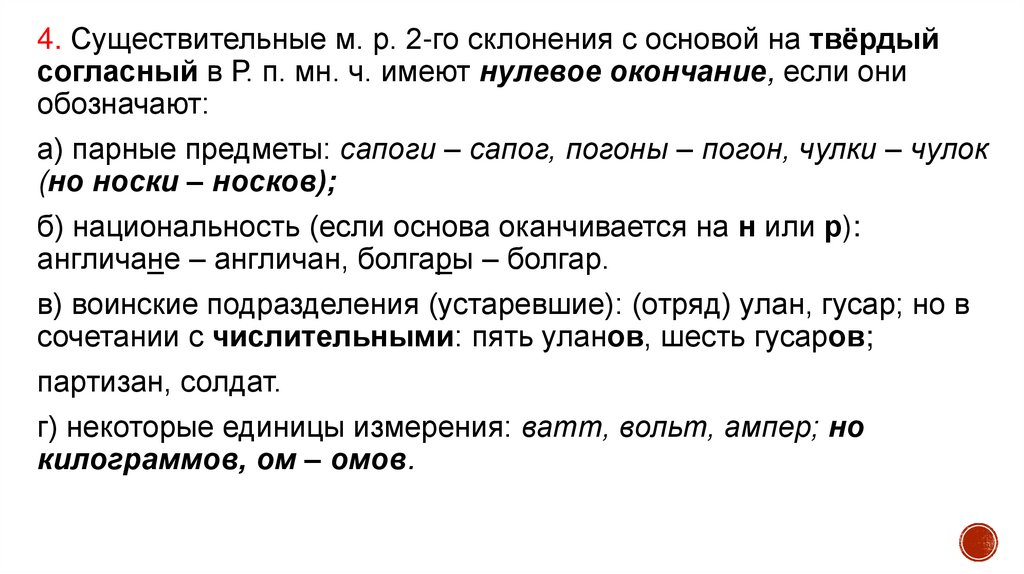 4. Существительные м. р. 2-го склонения с основой на твёрдыйсогласный в Р. п. мн. ч. имеют нулевое окончание, если они