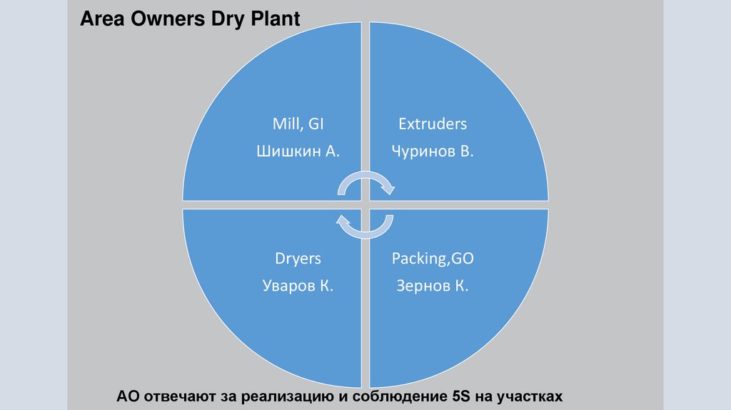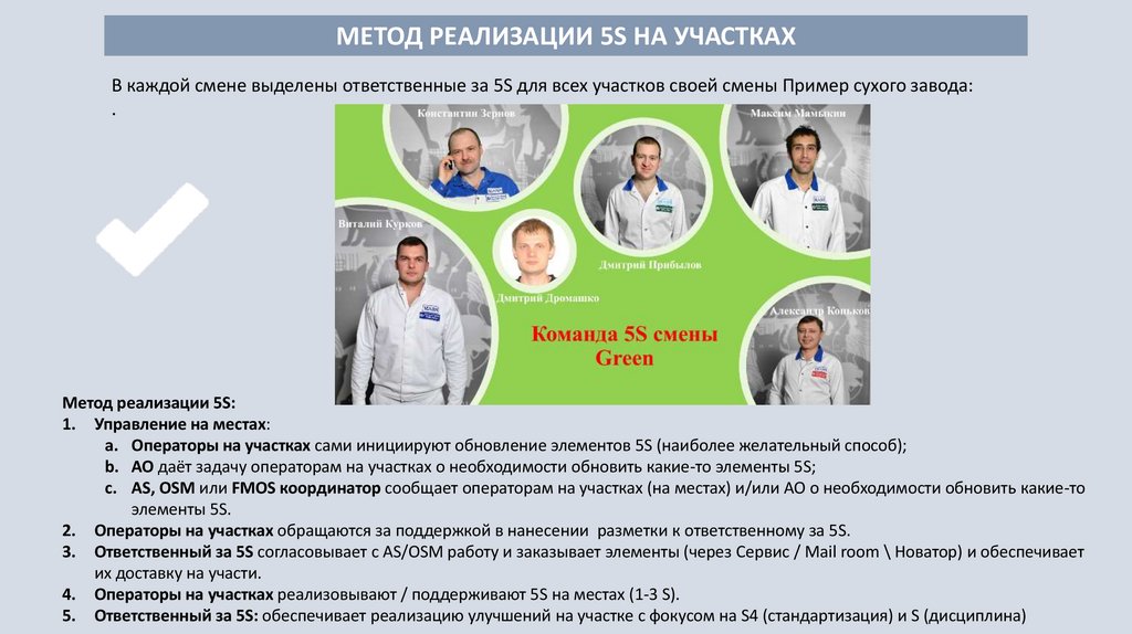 МЕТОД РЕАЛИЗАЦИИ 5S НА УЧАСТКАХВ каждой смене выделены ответственные за 5S для всех участков своей смены Пример сухого завода: