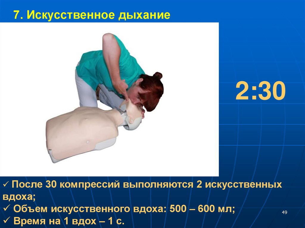 Через 30 компрессий выполняются 2 искусственных вдоха.