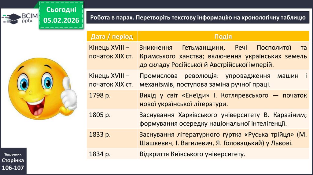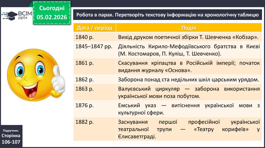 Робота в парах. Перетворіть текстову інформацію на хронологічну таблицю