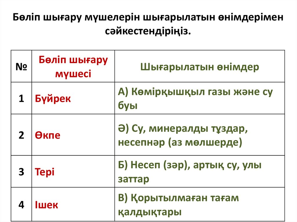 Бөліп шығару мүшелерін шығарылатын өнімдеріменсәйкестендіріңіз.