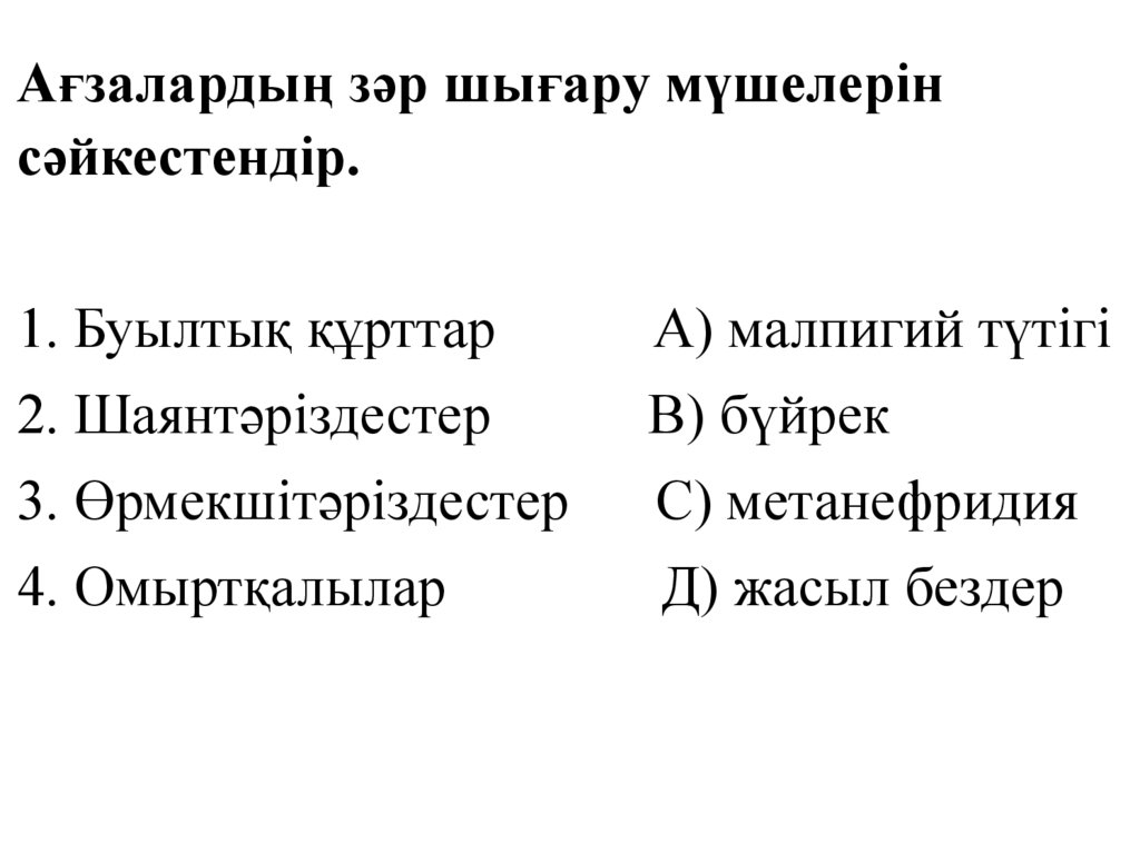 Ағзалардың зәр шығару мүшелерінсәйкестендір.