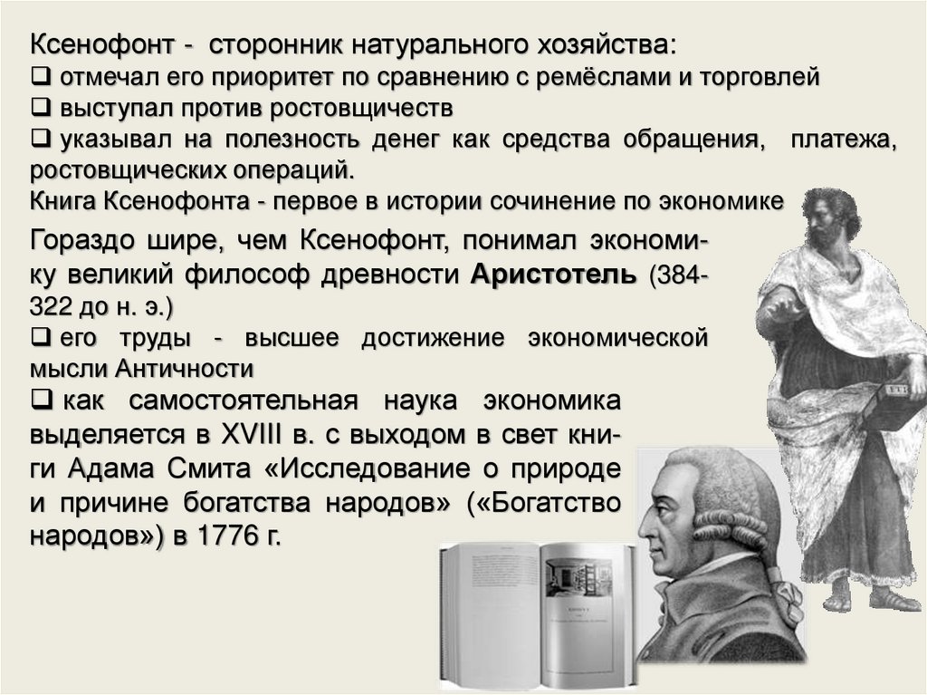 Ксенофонт - сторонник натурального хозяйства:отмечал его приоритет по сравнению с ремёслами и торговлей