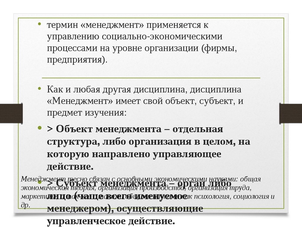 «Менеджмент» имеет свой объект, субъект, и