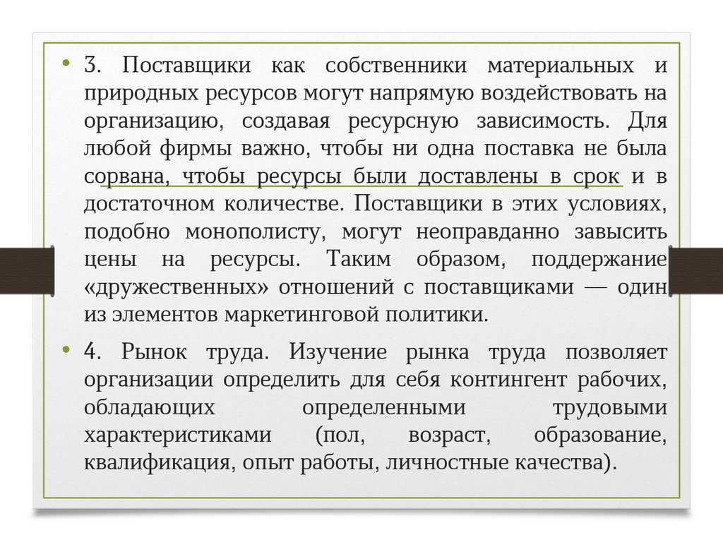 • 3. Поставщики как собственники материальных иприродных ресурсов могут напрямую воздействовать на