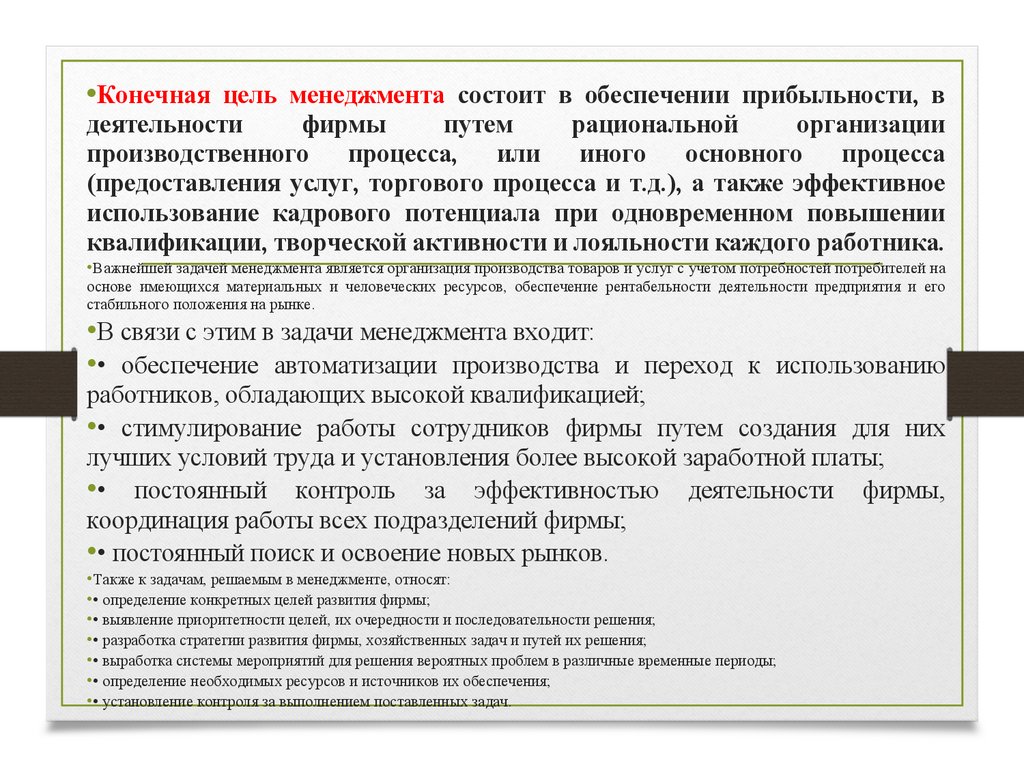 •Конечная цель менеджмента состоит в обеспечении прибыльности, вдеятельности