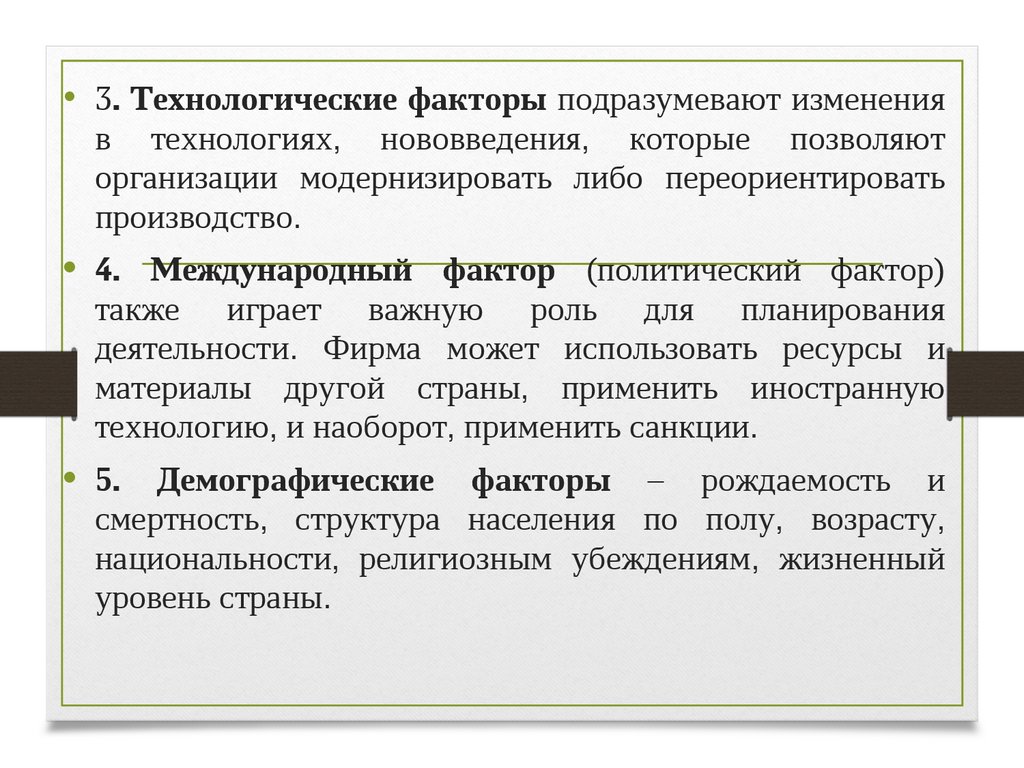 • 3. Технологические факторы подразумевают измененияв технологиях, нововведения, которые позволяют