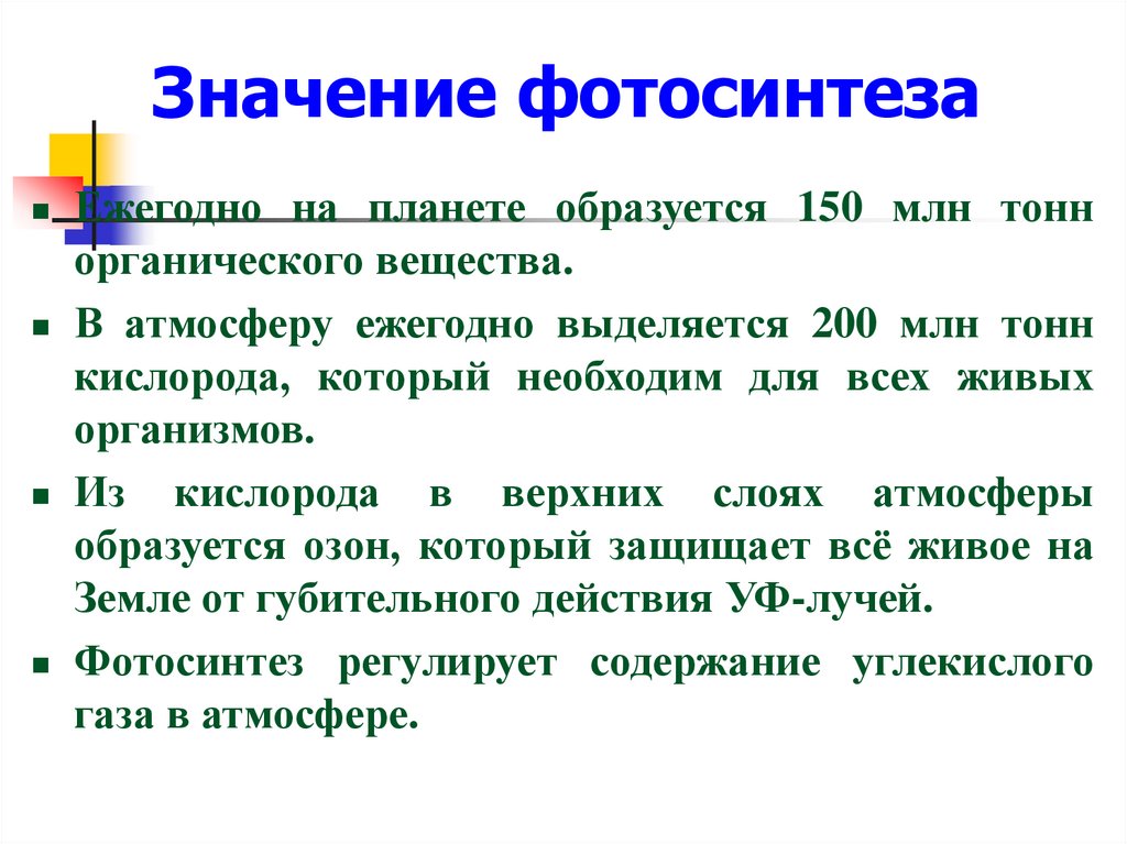 Значение фотосинтезаЕжегодно на планете образуется 150 млн тонн