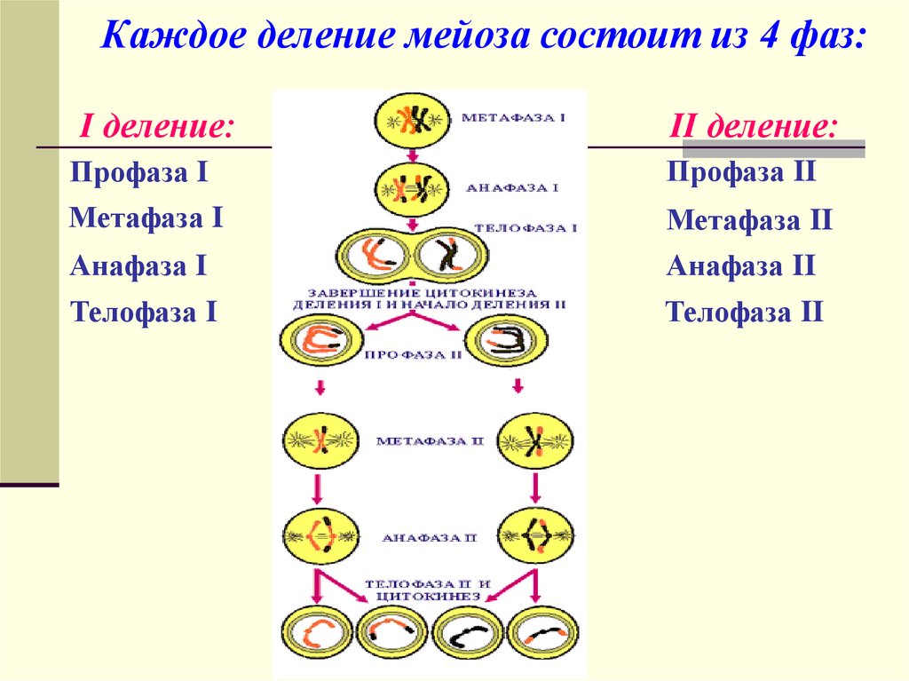 Каждое деление мейоза состоит из 4 фаз:I деление: