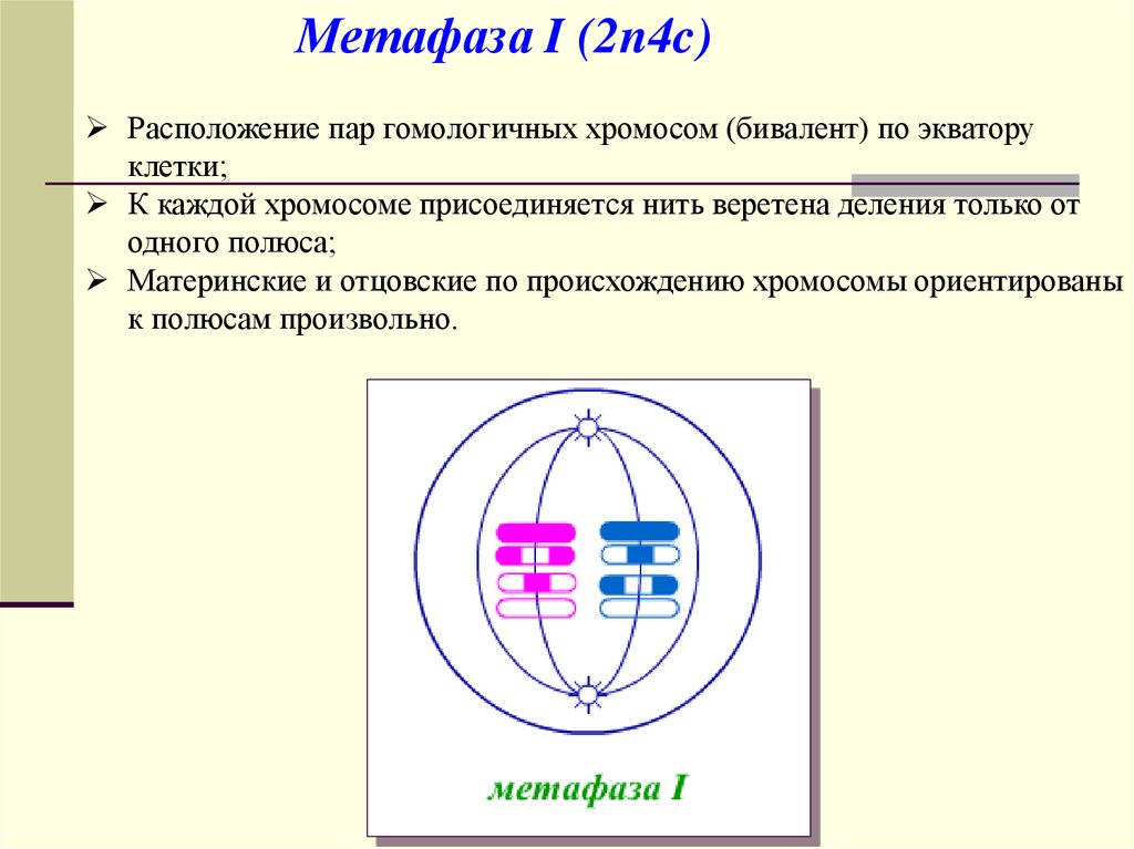 Метафаза I (2n4c)Расположение пар гомологичных хромосом (бивалент) по экватору