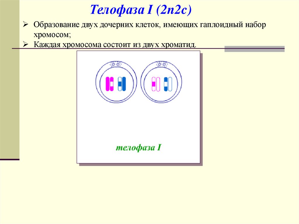 Телофаза I (2n2c)Образование двух дочерних клеток, имеющих гаплоидный набор