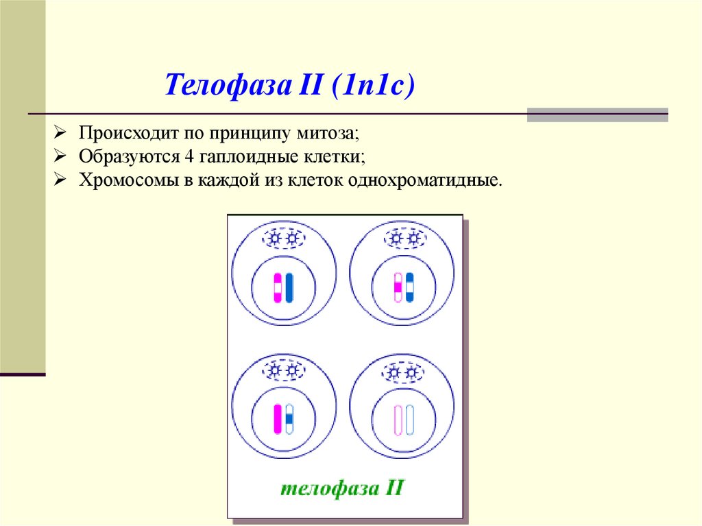 Телофаза II (1n1c)Происходит по принципу митоза;