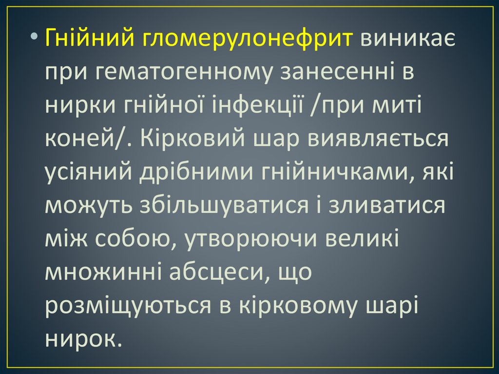 • Гнійний гломерулонефрит виникаєпри гематогенному занесенні в